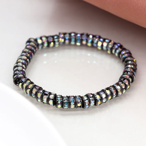 Metallic black and crystal edged disc bead stretch bracelet