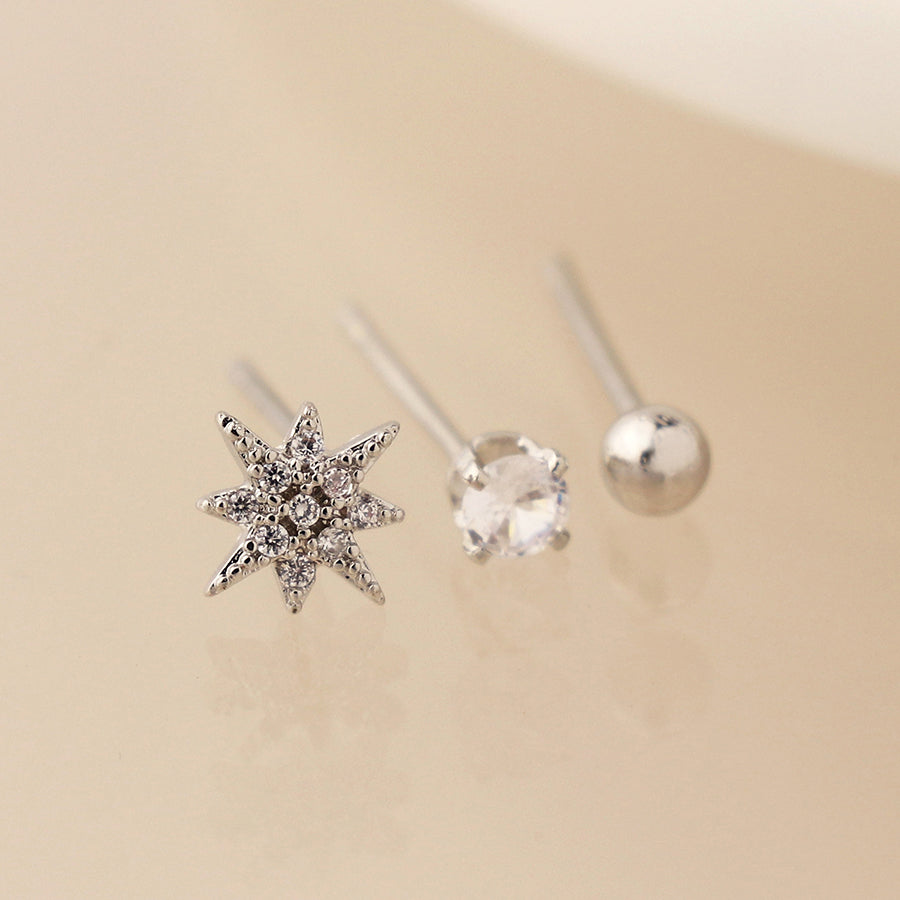Silver plated triple stud earring set with simple round bead, classic crystal and sparkle star earrings