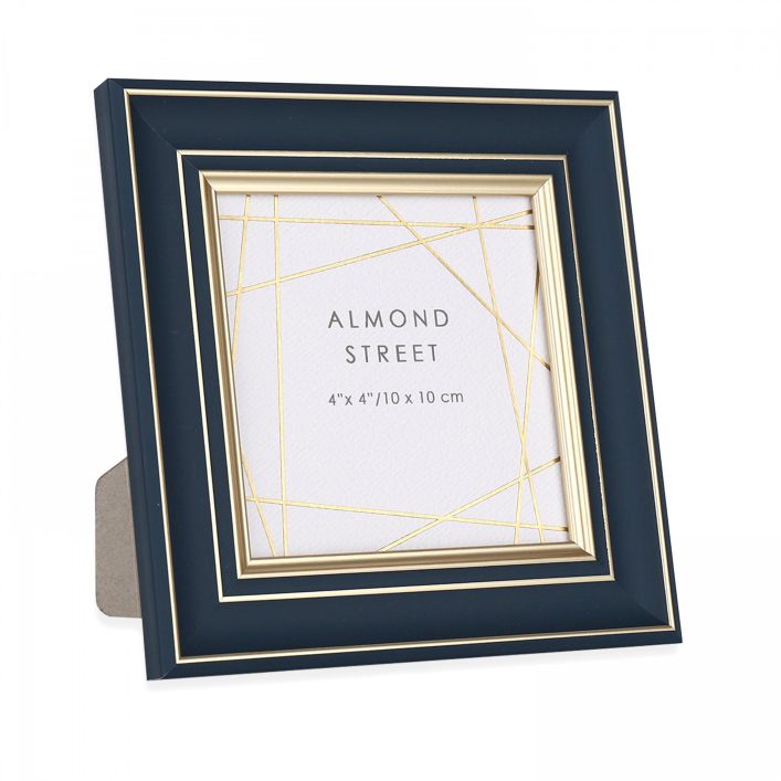 A striking navy photo frame in a matte finish ooze with elegance. A gold foil edge pivots the subtle profile that moves seamlessly around the frame. A gold inner lip catches attention. The stunning photo frame has a grey velvet window opening at the back to complete the overall aesthetic. The versatile style is available in two additional sizes: 6" x 4" and 7" x 5".