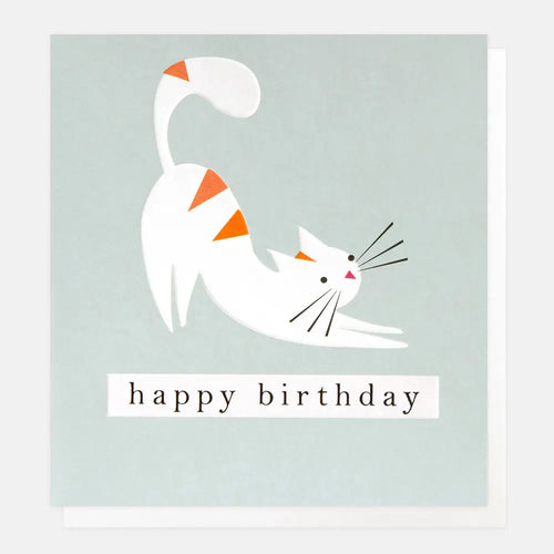 Happy Birthday Stripey Stretching Cat On Blue