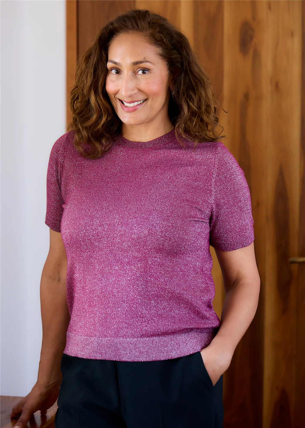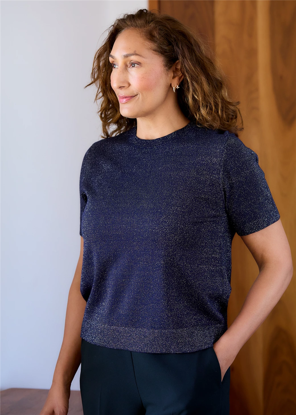 Add some glitz to your wardrobe with our short sleeve crew neck jumper. A great basic with a touch of sparkle; this style looks great paired with our pleat front trousers and heels for a dressy evening look.