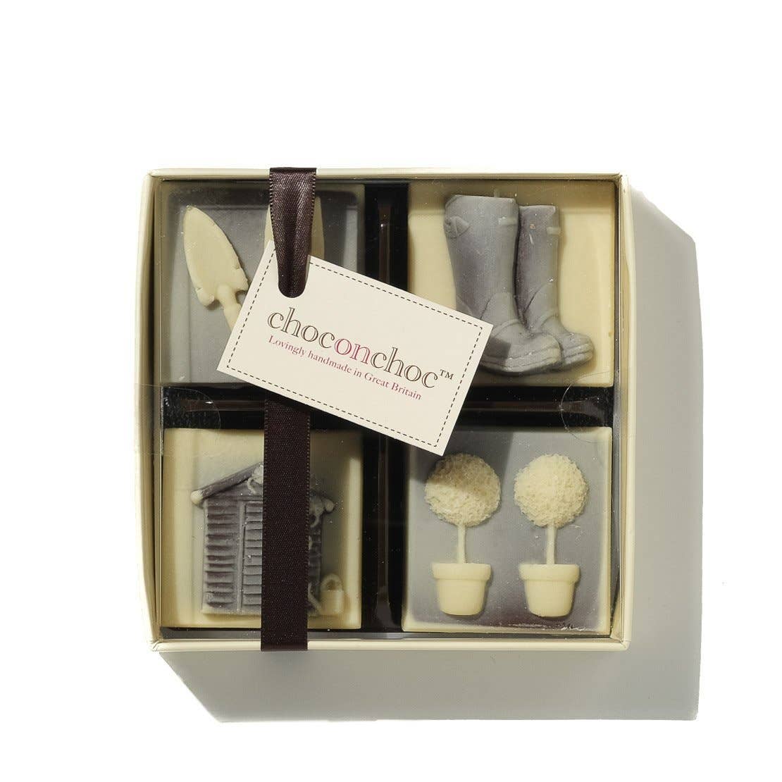 This selection of four beautifully detailed garden-themed chocolates has been handcrafted from the finest dark and white Belgian chocolate by our artisan chocolatiers. Featuring garden tools, topiary ball trees, wellies, and, of course, 'the shed', garden groomers everywhere will be sure to love this charming chocolate gift.