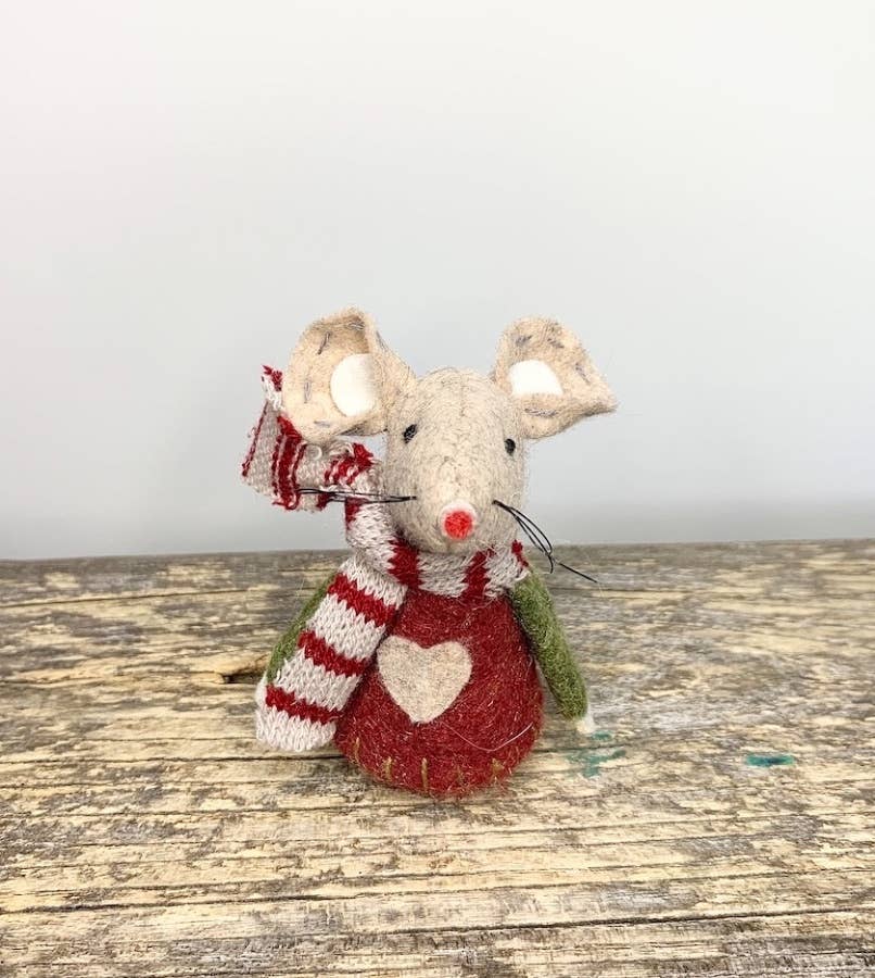 Red and Beige Fabric Mouse, 8cm  A sweet little fabric mouse decoration with a beige tone and little red felt jumper with heart touch  A delightful little character to place in your home this festive season